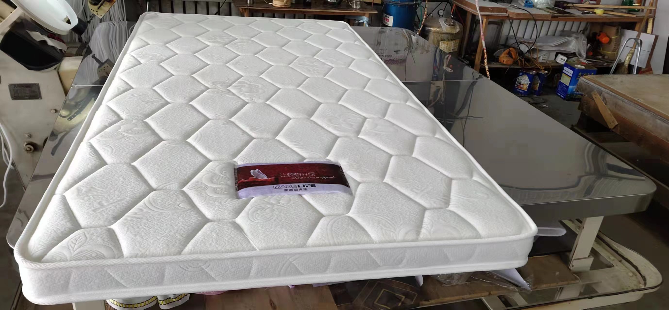 我廠還有自己獨立的床墊品牌,比特福,美迪麗,生產13種床墊,特尺加工。同時為了方便于每個客戶的需求,我們還代銷床墊輔料,裥花面料,各式花樣。